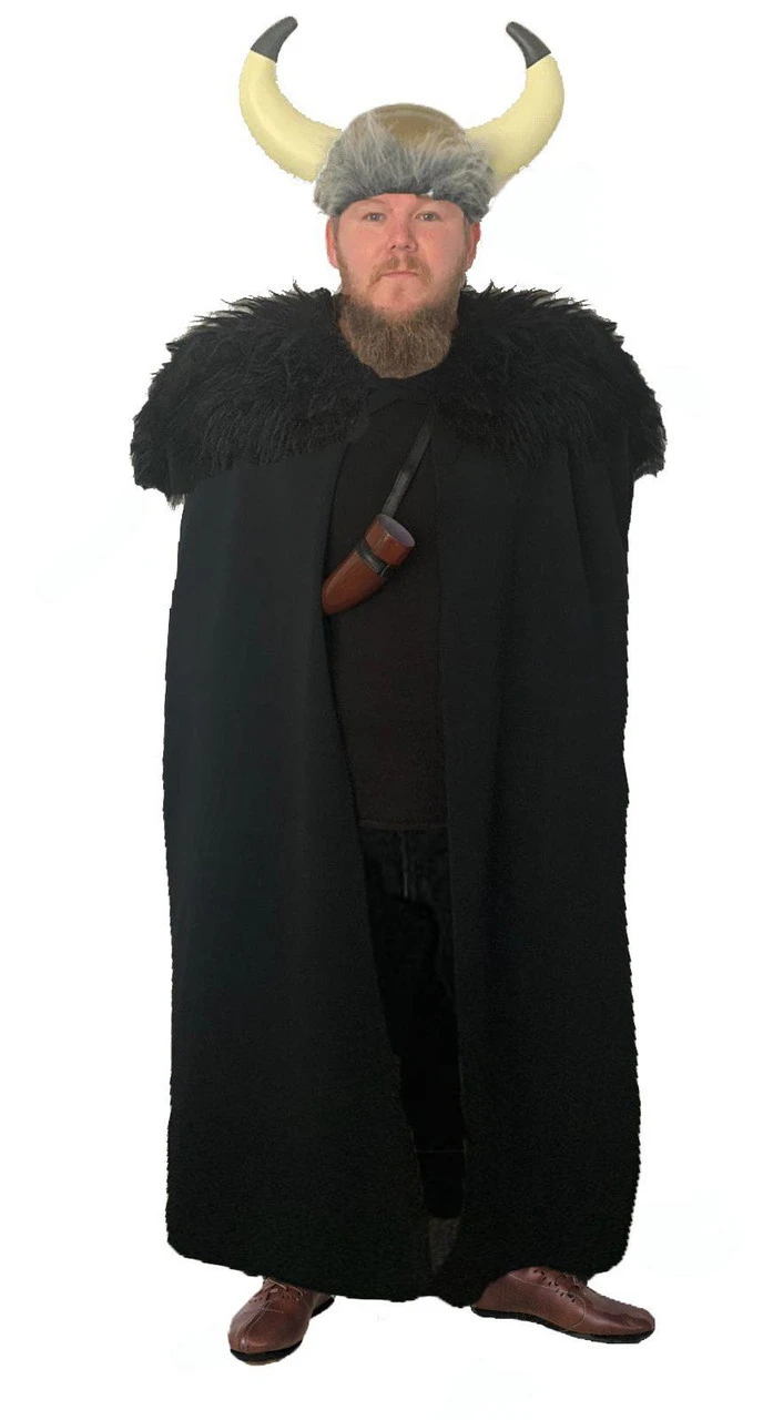 Black Viking Cape With Black Faux Fur Trimmed Collar, Includes Gold double Horn Viking Hat With Fur Trim ..