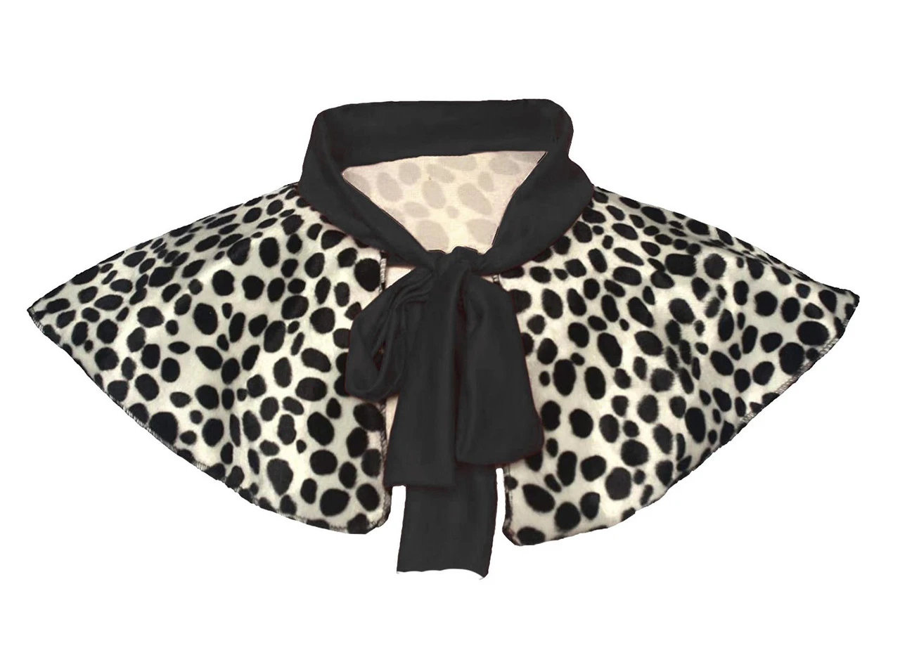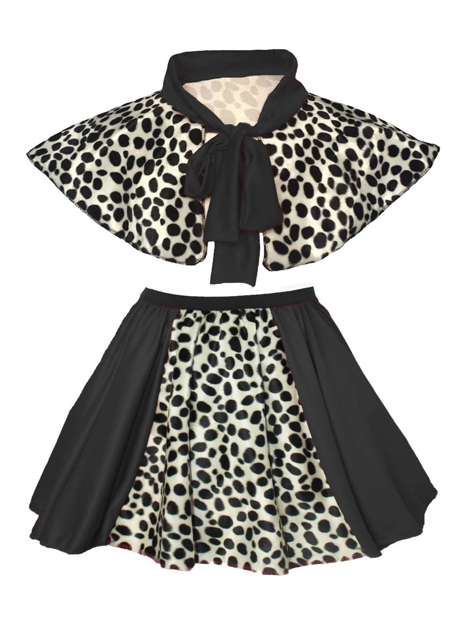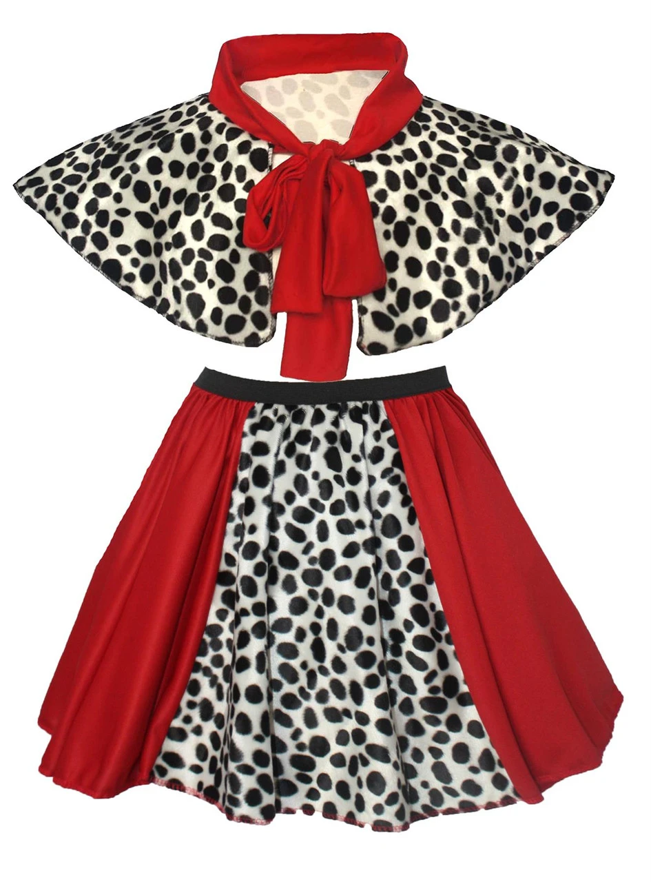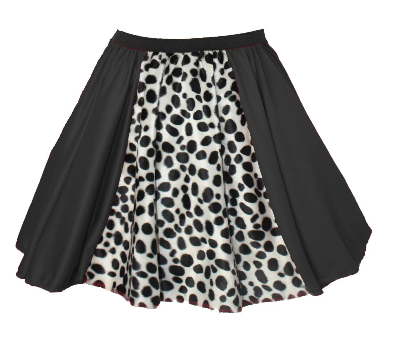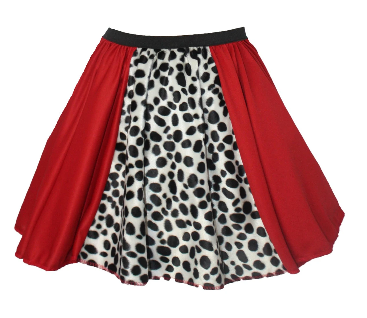 Adults Cruella Deville Black or Red 15″ Panel Skater Skirt With Dalmation Spot Decoration & Shawl