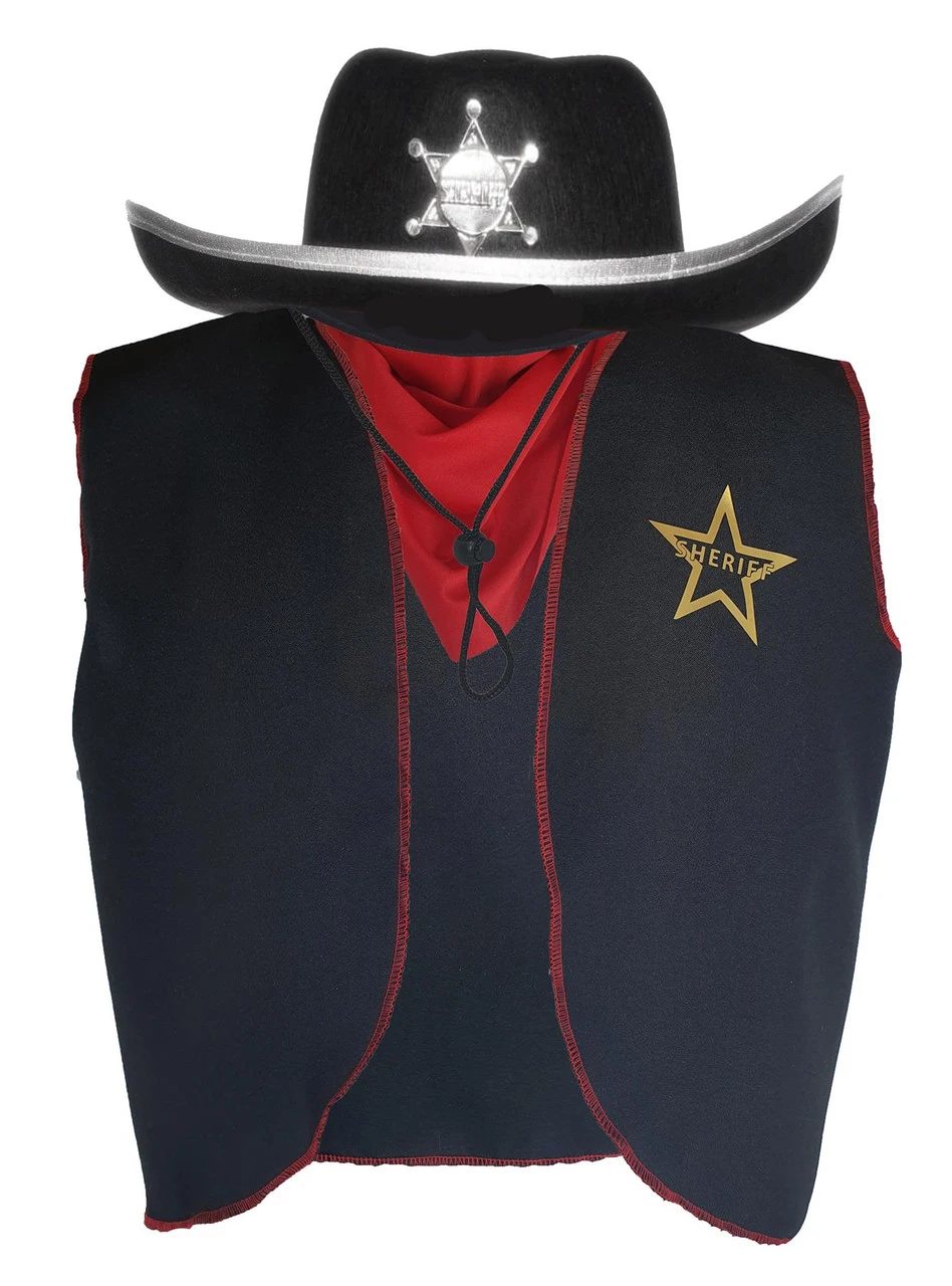 Includes: Waistcoat With Printed Sheriff Badge, Wild Rag (Neckerchief) & Black Sheriff Hat
