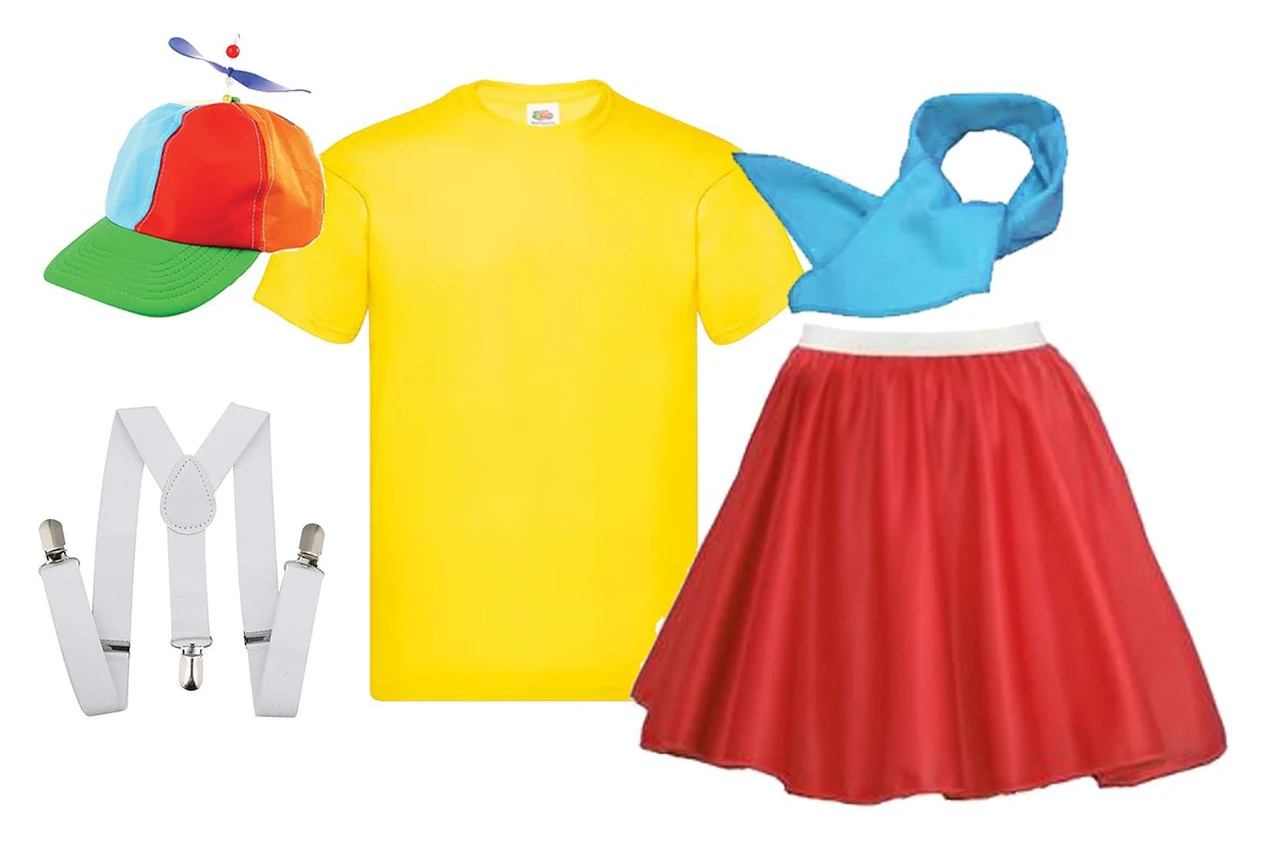 Costume Includes: Helicopter Hat, White Braces. Yellow T-Shirt, Red 15″ Skater Skirt & Blue Neck Scarf/Tie