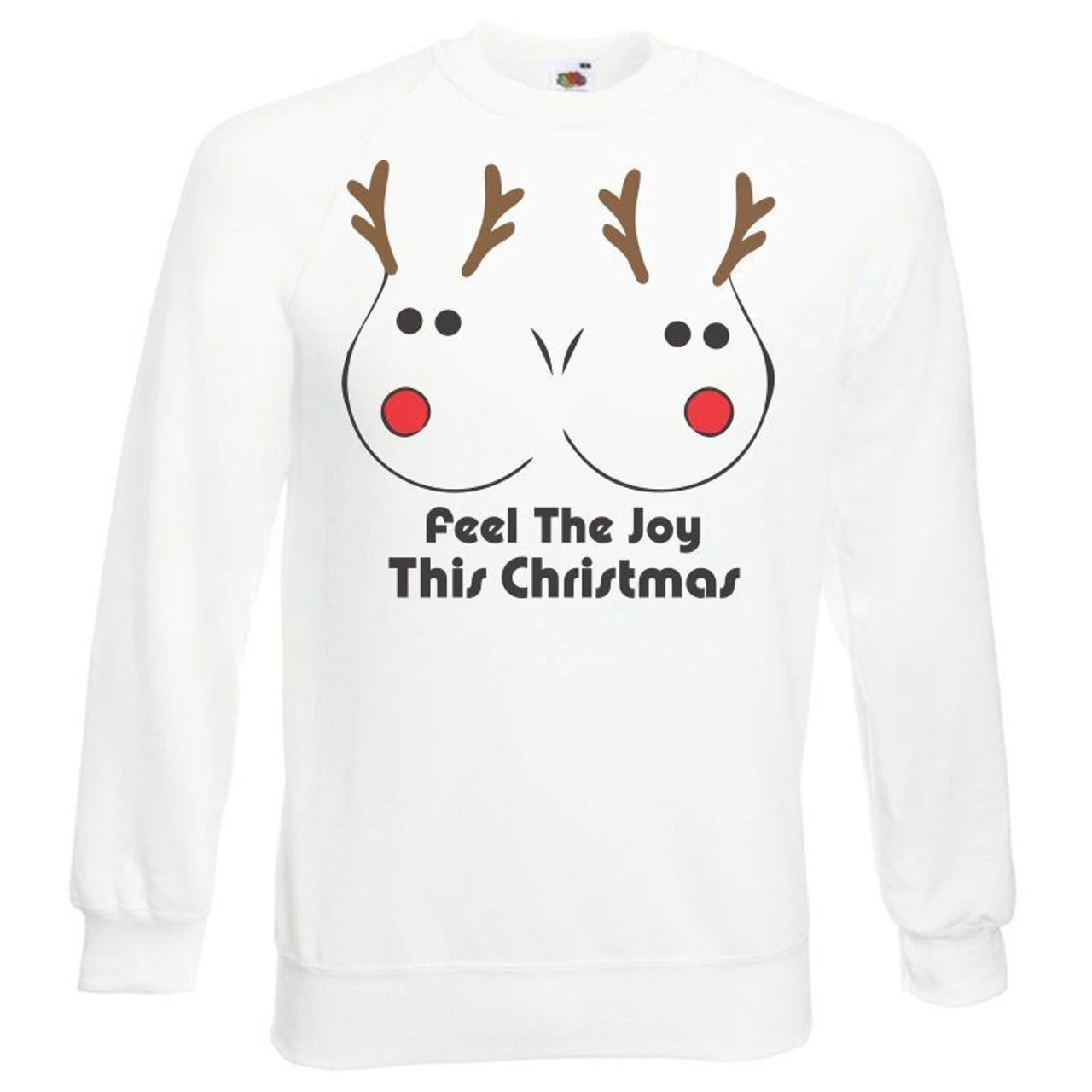 Adults Unisex Graphic With “Feel The Warmth” Funny Rude Rudolph Boobs Printed On A White Sweatshirt.